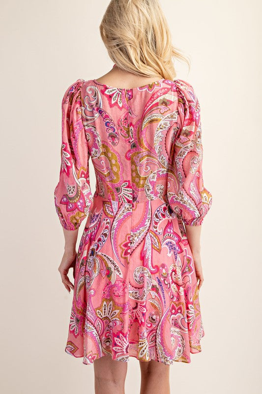 Paisley Puff Sleeve Dress PINK