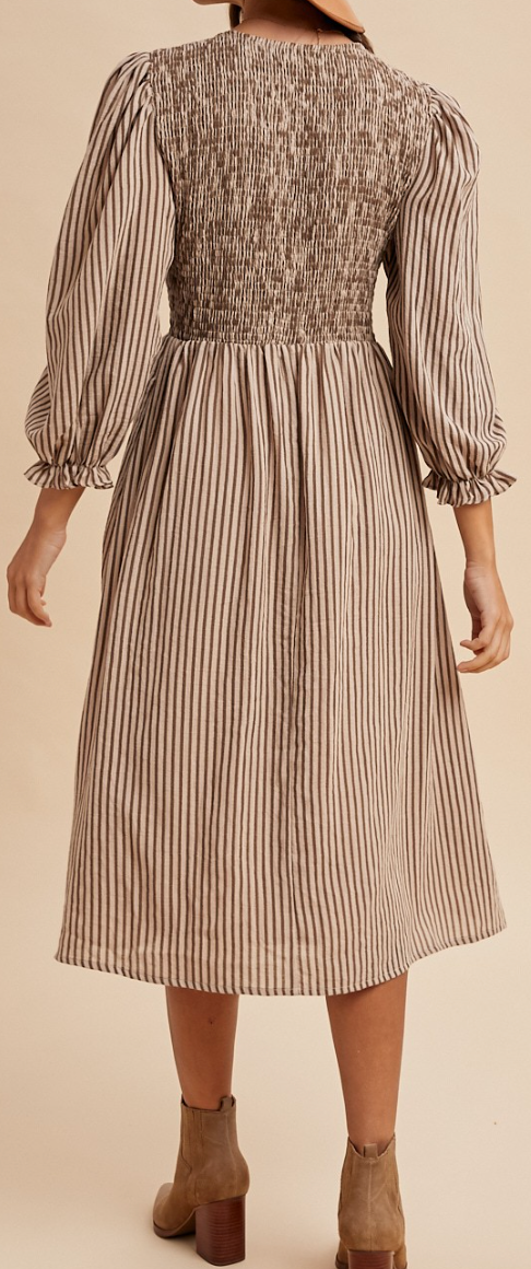 Stripe Smocking Bodice Midi Dress MOCHA