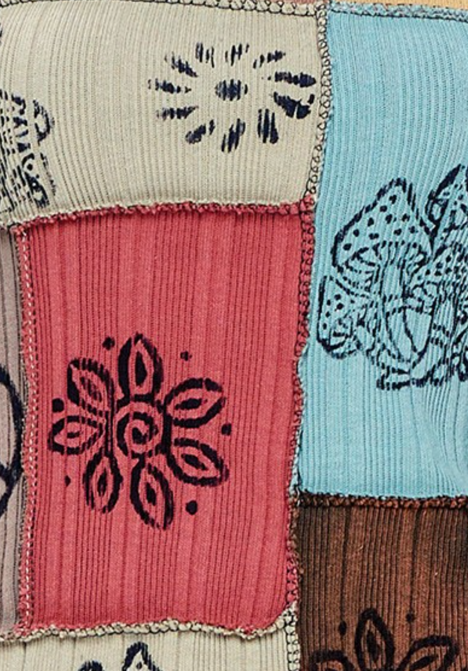 Embrace a boho casual vibe with this multicolor patchwork tank, perfect for Fall and Winter layering. Crafted from 100% cotton with stretchy fabric, it offers a comfortable, effortless fit. The exposed contrast stitching and spaghetti straps add unique, groovy details that capture the free-spirited hippie style. Elevate your wardrobe with this versatile piece that blends style and comfort seamlessly.