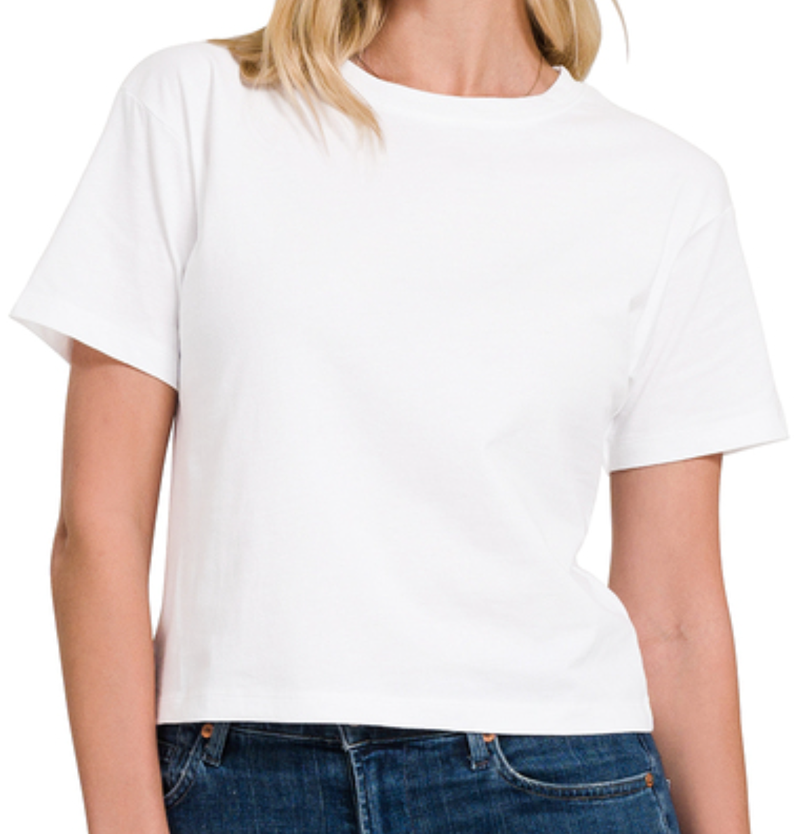 Experience comfort and style with our Cropped Essential Cotton T-Shirt in classic black. Made from 100% high-quality cotton, this short-sleeve tee offers a relaxed fit that keeps you cool and comfortable all day. Its crew neck and cropped length make it a versatile wardrobe staple, perfect for casual outings or layering. Elevate your everyday look with this breathable, durable cotton essential.