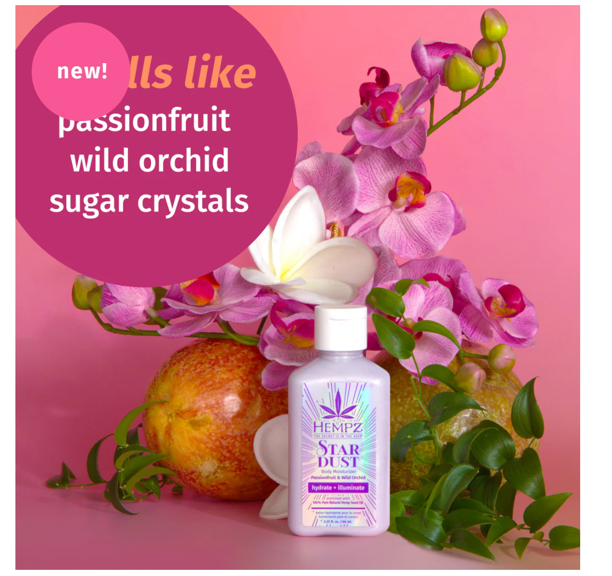 Dust Herbal Body Moisturizer. The hydrating body lotion adds a silver shimmer for highlighted sparkle with ethically sourced mica, a naturally occurring mineral. Passionfruit and wild orchid scent. 2.25oz in a flip top bottle.