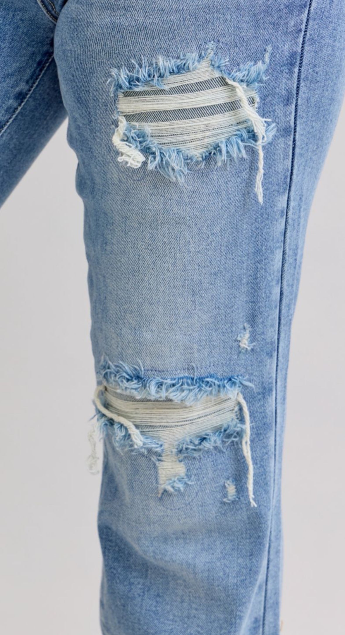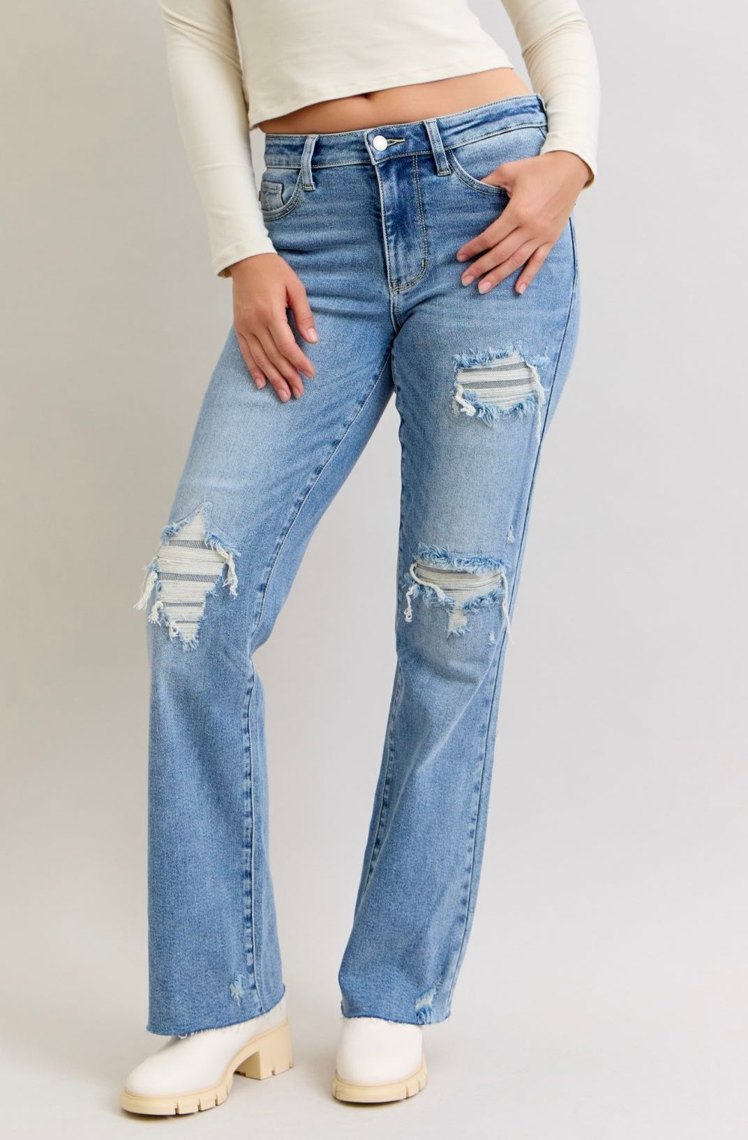 Step into effortless '90s style with these Judy Blue straight-leg jeans. Crafted from a premium cotton-blend fabric (94% cotton, 5% polyester, 1% spandex), they offer the perfect balance of durability and stretch for all-day comfort. The mid-rise cut sits beautifully at 9¾", while the 32" inseam delivers a classic, flattering fit. Distressed details feature reinforced backing, giving you that coveted vintage look without exposed skin. Perfect for creating endless outfit combinations, these jeans are a wardrobe essential that never goes out of style.
