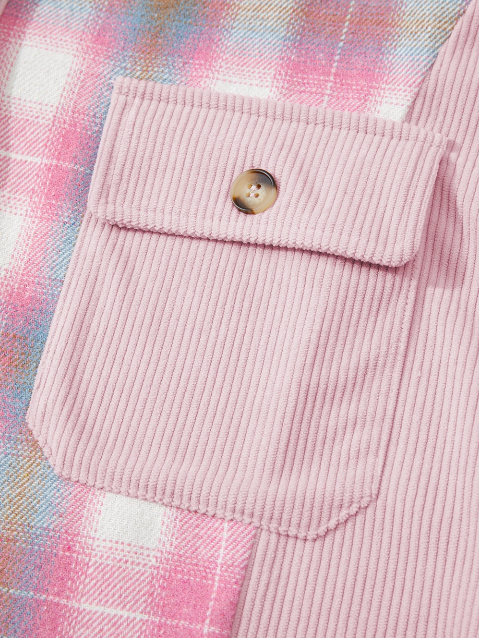 Layer with confidence in this pink plaid corduroy shacket, featuring eye-catching patchwork details and practical flap pockets. Crafted from soft 100% polyester, it drapes beautifully while maintaining its shape through countless wears. The brushed texture adds depth and visual interest, making it an instant standout piece. Whether you're dressing up basics or adding edge to your everyday look, this versatile shacket transitions seamlessly from season to season. A must-have for anyone seeking style that doesn't compromise on comfort.