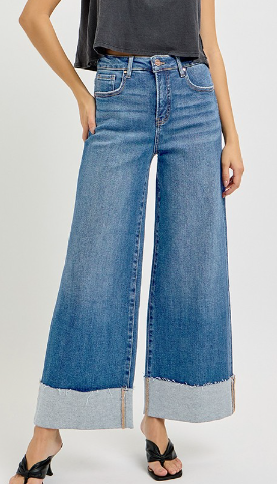 Experience flattering fit and versatile style with the RISEN Tummy Control High Rise Crop Wide Cuffed Jeans. Designed with a 10 3/4" rise and a convertible 27 1/2" cuffed inseam (31 1/2" uncuffed), these jeans smooth your waist while offering customizable length. Crafted from a comfortable blend of cotton, polyester, and spandex, they provide just the right stretch for all-day wear. Perfect for elevating your look with effortless confidence.